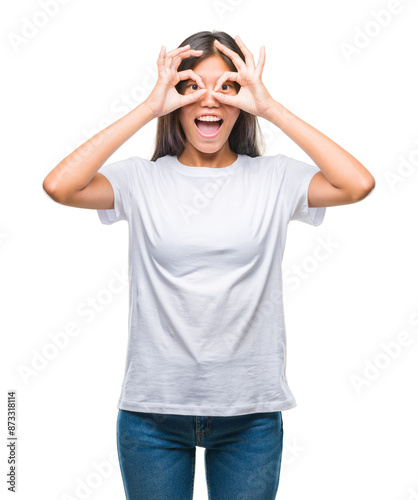 Young asian woman over isolated background doing ok gesture like binoculars sticking tongue out, eyes looking through fingers. Crazy expression.