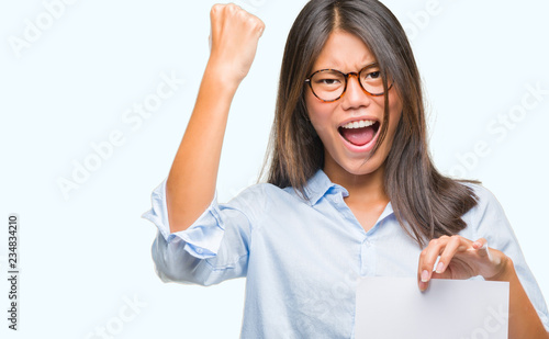 Young asian woman over isolated background holding blank paper annoyed and frustrated shouting with anger, crazy and yelling with raised hand, anger concept