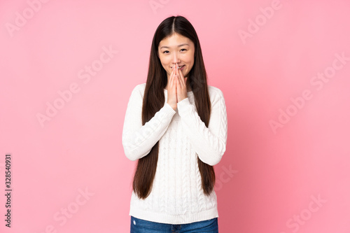 Young asian woman over isolated background keeps palm together. Person asks for something