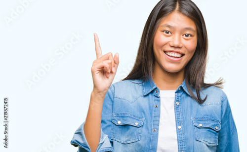Young asian woman over isolated background pointing finger up with successful idea. Exited and happy. Number one.
