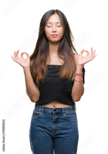 Young asian woman over isolated background relax and smiling with eyes closed doing meditation gesture with fingers. Yoga concept.