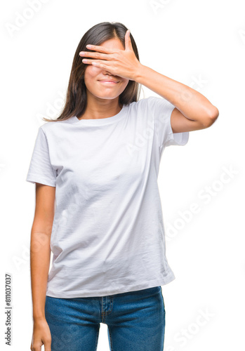 Young asian woman over isolated background smiling and laughing with hand on face covering eyes for surprise. Blind concept.