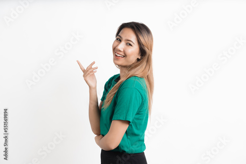 Young asian woman pointing at your product and looks at it isolate on white background.