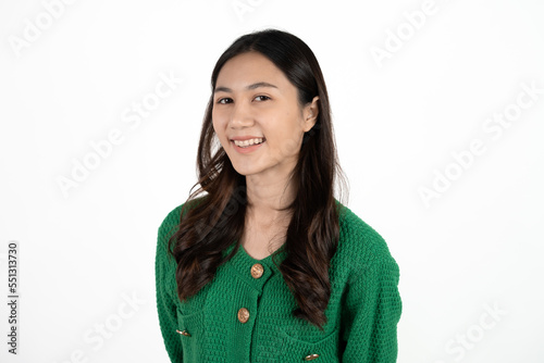 Young asian woman, professional entrepreneur standing in office clothing, smiling and looking confident, white background.