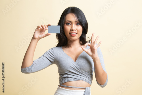 Young Asian woman show OK with a blank card.