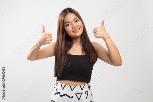 Young Asian woman show two thumbs up.