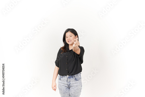 Young Asian woman Showing korean love finger wearing Black t-shirt and jeans isolated on white background