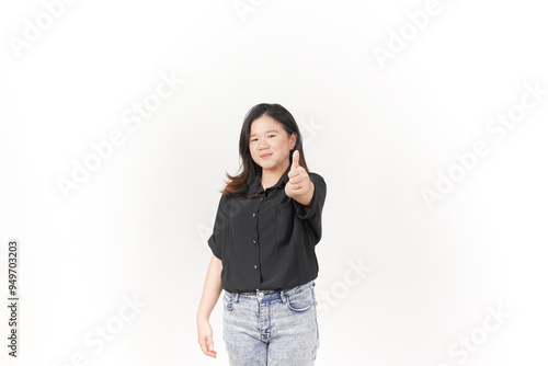Young Asian woman showing thumbs up, okay or agree concept wearing Black t-shirt and jeans isolated on white background