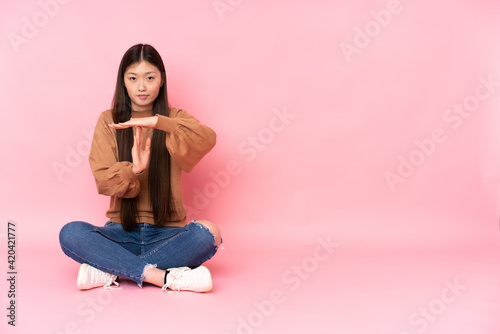 Young asian woman sitting on the floor isolated on pink background making time out gesture