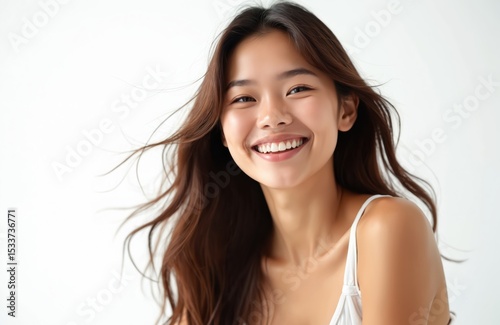 Young asian woman smiling with perfect white teeth. Studio portrait of cheerful attractive girl with long brown hair, natural makeup. Happy lady on white background for beauty, dentistry, healthcare