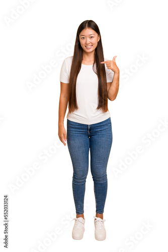 Young asian woman standing, full body cutout isolated person pointing by hand to a shirt copy space, proud and confident