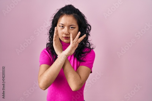 Young asian woman standing over pink background rejection expression crossing arms doing negative sign, angry face