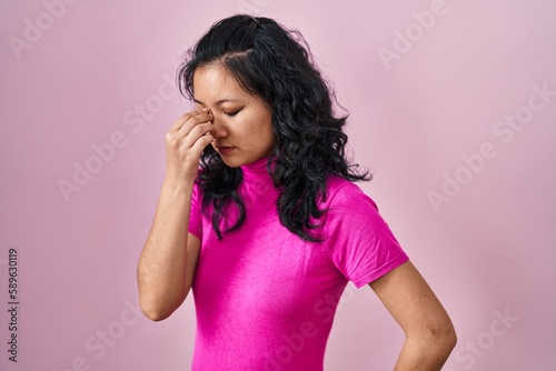 Young asian woman standing over pink background tired rubbing nose and eyes feeling fatigue and headache. stress and frustration concept.