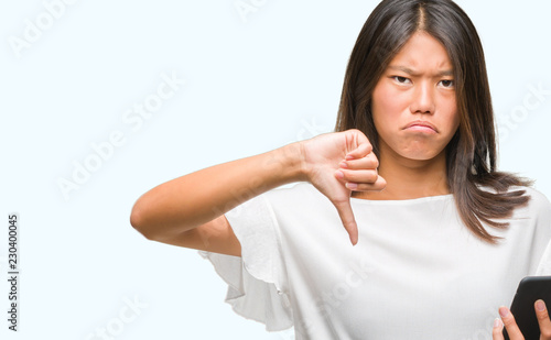 Young asian woman texting using smartphone over isolated background with angry face, negative sign showing dislike with thumbs down, rejection concept