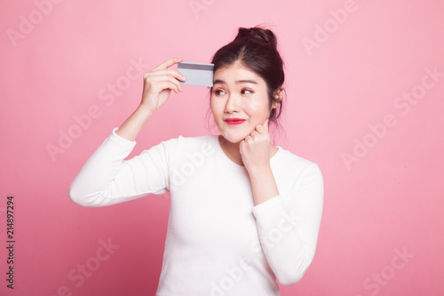 Young Asian woman think with a blank card.