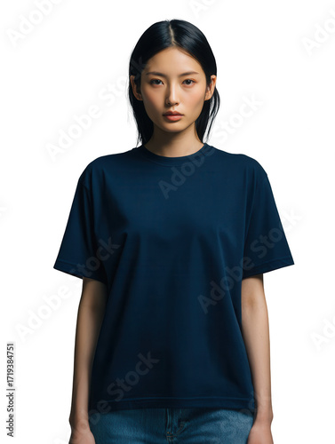 Young asian woman wearing a plain navy blue tshirt and jeans, isolated on transparent background