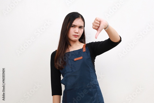 Young Asian woman wearing blue appron looking unhappy and angry showing rejection and negative with thumbs down gesture. bad expression