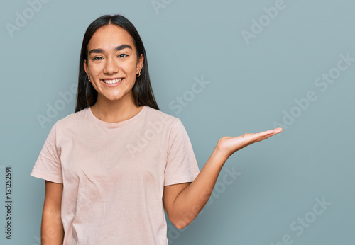 Young asian woman wearing casual clothes smiling cheerful presenting and pointing with palm of hand looking at the camera.