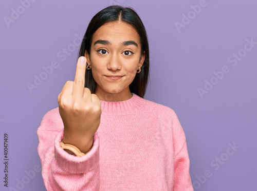 Young asian woman wearing casual winter sweater showing middle finger, impolite and rude fuck off expression