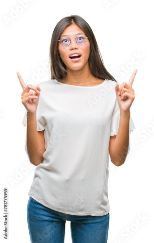 Young asian woman wearing glasses over isolated background amazed and surprised looking up and pointing with fingers and raised arms.