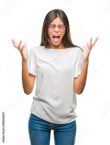 Young asian woman wearing glasses over isolated background celebrating mad and crazy for success with arms raised and closed eyes screaming excited. Winner concept