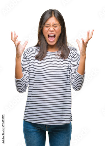 Young asian woman wearing glasses over isolated background crazy and mad shouting and yelling with aggressive expression and arms raised. Frustration concept.