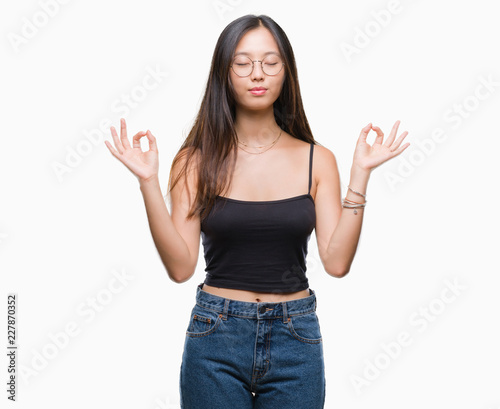 Young asian woman wearing glasses over isolated background relax and smiling with eyes closed doing meditation gesture with fingers. Yoga concept.