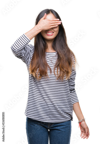 Young asian woman wearing glasses over isolated background smiling and laughing with hand on face covering eyes for surprise. Blind concept.