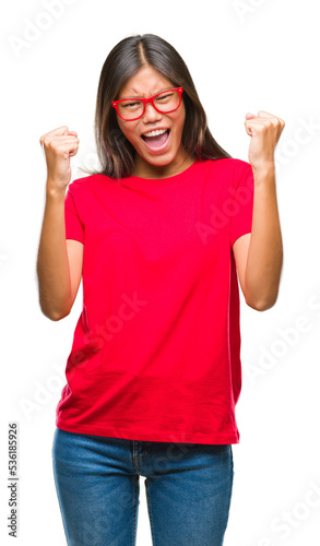 Young asian woman wearing glasses over isolated background very happy and excited doing winner gesture with arms raised, smiling and screaming for success. Celebration concept.
