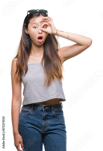 Young asian woman wearing sunglasses over isolated background doing ok gesture shocked with surprised face, eye looking through fingers. Unbelieving expression.