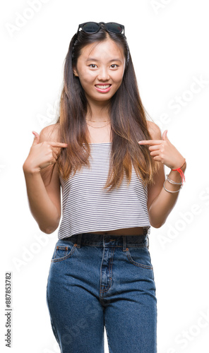 Young asian woman wearing sunglasses over isolated background looking confident with smile on face, pointing oneself with fingers proud and happy.