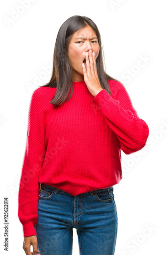 Young asian woman wearing winter sweater over isolated background bored yawning tired covering mouth with hand. Restless and sleepiness.