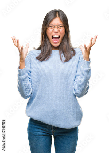 Young asian woman wearing winter sweater over isolated background celebrating crazy and amazed for success with arms raised and open eyes screaming excited. Winner concept