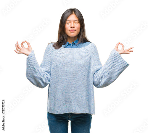 Young asian woman wearing winter sweater over isolated background relax and smiling with eyes closed doing meditation gesture with fingers. Yoga concept.