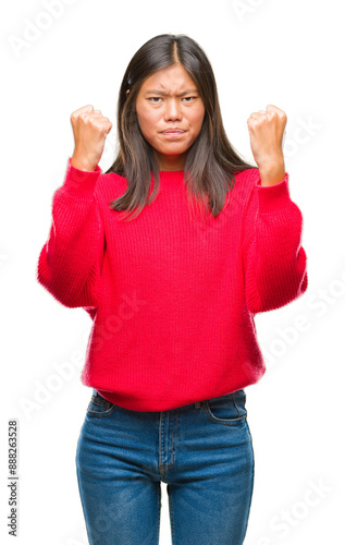 Young asian woman wearing winter sweater over isolated background very happy and excited doing winner gesture with arms raised, smiling and screaming for success. Celebration concept.
