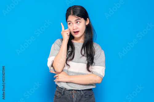 Young Asian woman with a curious and surprised expression, raising her index finger as if having an idea. She looks thoughtful and inspired, standing against a blue background.