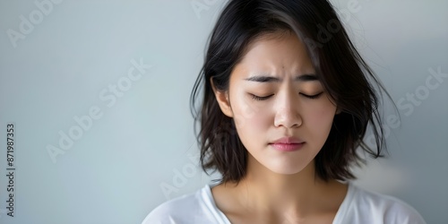Young Asian woman with acid reflux symptoms seeking treatment options. Concept Acid Reflux Symptoms, Treatment Options, Young Asian Woman, Digestive Health, Seeking Help