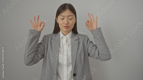 Young asian woman with closed eyes meditating in a gray suit over an isolated white background.