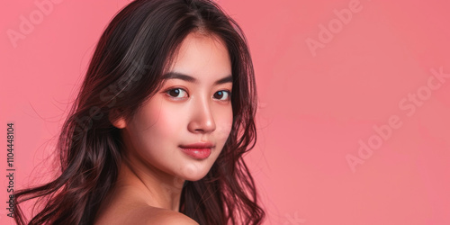 young Asian woman with smooth skin and silky hair close-up portrait pink background Generative AI