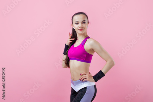 Young athletic attractive girl brunette with a ponytail in a bright tight top straightens her hair, high ponytail.