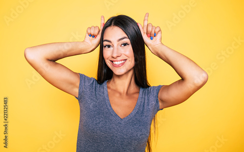 Young attractive cute brunette woman in gray T-shirt is posing and looking on camera isolated over yellow wall