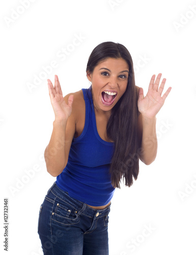 young attractive hispanic woman in casual top and jeans smiling happy and cheerful isolated