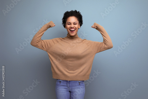 young attractive latin woman with black afro hair pulled back in ponytail isolated on background with copy space