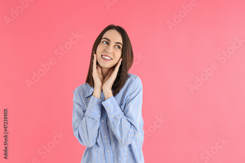 Young attractive woman in shirt on pink background