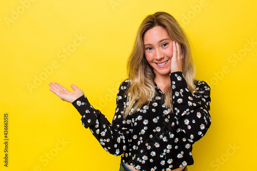 Young australian woman isolated holds copy space on a palm, keep hand over cheek. Amazed and delighted.