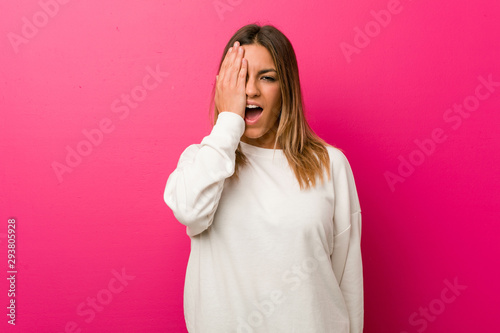 Young authentic charismatic real people woman against a wall having fun covering half of face with palm.