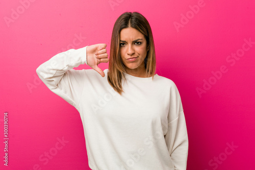 Young authentic charismatic real people woman against a wall showing a dislike gesture, thumbs down. Disagreement concept.