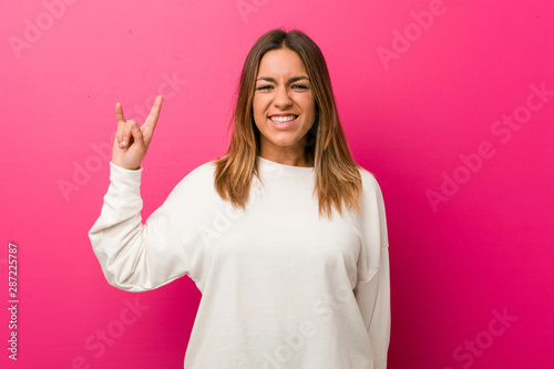 Young authentic charismatic real people woman against a wall showing a horns gesture as a revolution concept.
