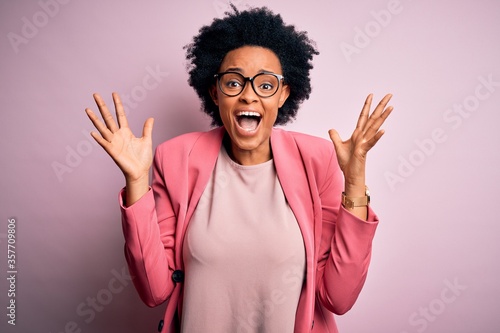 Young beautiful African American afro businesswoman with curly hair wearing pink jacket celebrating crazy and amazed for success with arms raised and open eyes screaming excited. Winner concept