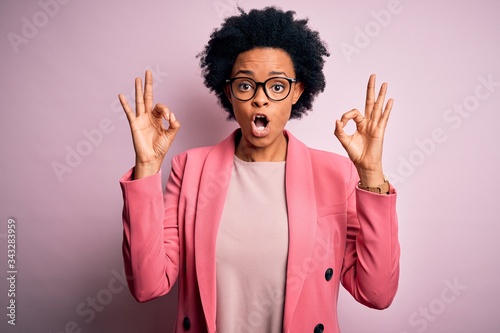 Young beautiful African American afro businesswoman with curly hair wearing pink jacket looking surprised and shocked doing ok approval symbol with fingers. Crazy expression